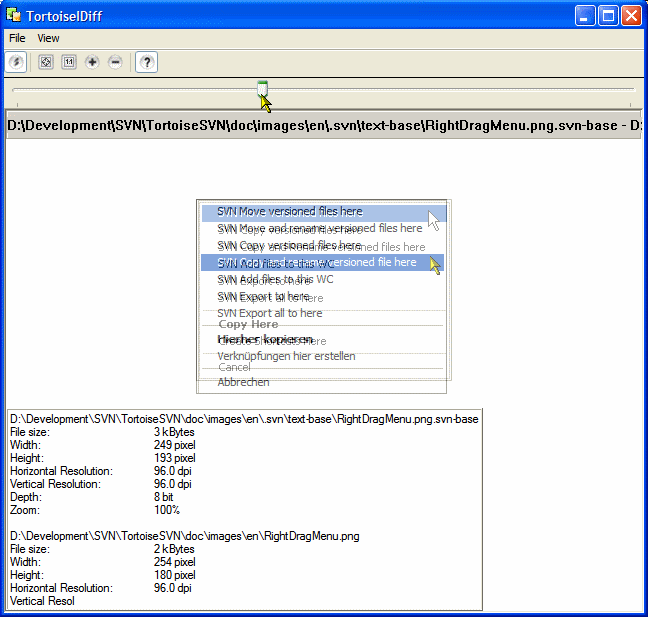 이러한 파일들의 경우 일반적인 파일 비교 도구를 사용할 수 없습니다. 일반 도구는 텍스트 파일에서만 작동하며 한 줄씩 비교하기 때문입니다. 바로 이때 Tortoise 이미지 비교 도구 (TortoiseIDiff)가 해결책이 됩니다. 이 도구는 두 이미지를 나란히 표시하거나, 심지어 서로 겹쳐서 알파 블렌딩으로 표시할 수도 있습니다.