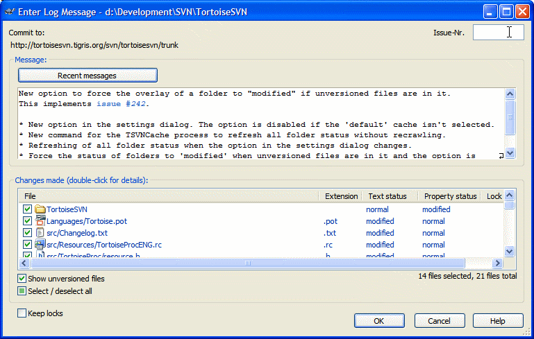 - 또는 TortoiseSVN은 입력된 로그 메시지 중 이슈 트래커가 인식하는 부분을 강조 표시할 수 있습니다. 이를 통해 사용자는 로그 메시지가 올바르게 구문 분석될 수 있음을 알 수 있습니다.