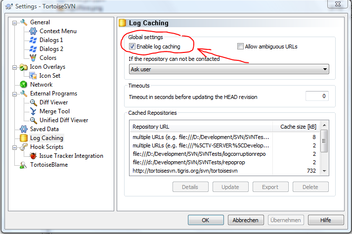 저장소에 직접 액세스할 수 없거나 다른 이유로 UUID를 변경할 수 없는 경우, TortoiseSVN 설정 대화 상자에서 로그 캐시를 비활성화할 수 있습니다: