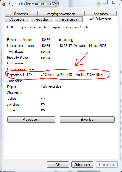 작업 사본이 있는 경우 속성 대화 상자(탐색기 상황에 맞는 메뉴 '속성')에서 저장소의 UUID를 확인할 수 있습니다.